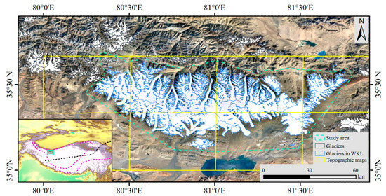 The WKL is located in the northwest of the TP and is one of the highest elevation areas in the world (Figure 1). According to CGI-2, there are 433 glaciers in WKL with an area of 2961.3 km2 [6]. The glaciers have limited debris cover, accounting for approximately 3% of the total glacier area [15]. Of all the glaciers in High Mountain Asia, the WKL glaciers are located in the most continental climate because the WKL is the coldest and driest region on and around the Tibetan Plateau [16].