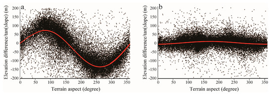 Scatter plot of slope-standardized altitudinal differences in the terrain aspect for off-glacier areas. (a) Before co-registration and (b) after co-registration.