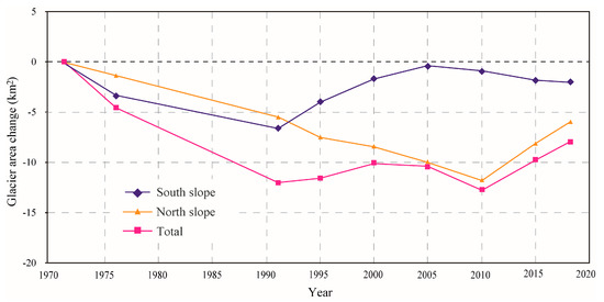 The area of the northern slope glacier decreased by 5.95 km2 from 1972 to 2018 including a continuous decrease of 11.8 km2 from 1972 to 2010 and an increase of 5.85 km2 from 2010 to 2018. The change in the area of the southern slope glacier was relatively small. The area of the southern slope glacier decreased by 2.0 km2 from 1972 to 2018, including a decrease of 6.5 km2 from 1972 to 1991 and an increase of 6.2 km2 from 1991 to 2005 (Table 2, Figure 3). The area of the glaciers on the south and north slopes of the WKL decreased notably from 1972 to 1991, resulting in a significant decrease in the total area of glaciers. From 1991 to 2010, the area of the north slope decreased and the area of the south slope increased, making the total area approximately stable with slight fluctuations. From 2010 to 2018, the increase in the total area of glaciers was mainly due to the contribution from the northern slope.