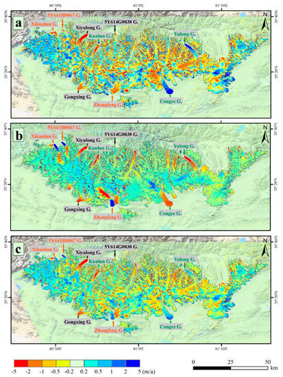 According to the two categories of thickness changes for the different glaciers in the WKL, we believe that the category one of glaciers are normal glaciers, which conform to the general glacier change patterns. The thickness of the ablation zone is thin, and the accumulation zone is thick. The thickness change pattern of the category two of the glacier should be caused by glacier surging. It is clearly seen that surge events occurred over the Congce G., Yulong G. and Kunlun G. from the 1970s to 2000 and the Zhongfeng G., Xikunlun G. and 5Y641H0067 G. from 2000 to 2016. Glacial surging will have a certain effect on the change in glaciers. When glacier surging occurs, the rapid movement transports the mass in the accumulation zone to the ablation zone and causes the glacier to advance and increase in area. At this time, the accumulation zone is thinned, and the ablation zone is thickened; after glacier surging, a large amount of mass is exposed to the ablation zone, causing subsequent rapid melting [45,46].