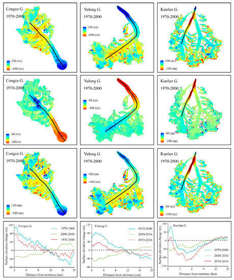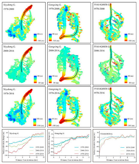 Most glaciers exhibited almost the same thickness variation characteristics between 1970–2000 and 2000–2016. At lower elevations, there were large mass losses. As the altitude increased, glacier thinning gradually weakened. The upper part of the glacier thickened. These patterns are similar to most glacier changes around the TP, such as in the Gongga Mountains [43] or Qilian Mountains [41]. Figure 5 shows the distribution of surface elevation changes of three typical glaciers and their changes along the longitudinal section. For example, in Xiyulong G., glacier thinning was at its maximum at low elevations near the terminus. As the altitude increased, the thinning of the glacier gradually weakened. At 9 km from the terminus, the surface elevation change of the glacier changed to 0; when the altitude increased again, the surface elevation change of the glacier began to increase in the periods from 1970 to 2000, 2000 to 2016 and 1970 to 2016. The same glacier surface elevation change pattern also exists in Gongxing G. and 5Y614G0038 G (Figure 5).