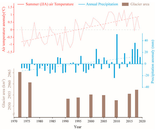 Climate change is generally considered to be the main factor causing glacier change [41,48]. To understand the relationship between climate and glacier change here, we analyzed meteorological data from six stations (Pishan, Hotan, Yutian, Mingfeng, Shijiehe and Geze). Meteorological data can be downloaded from the China Meteorological Data Sharing Service system (http://cdc.cma.gov.cn/). Using annual precipitation and summer (June, July and August) average air temperature data from 1973 to 2019, we present the climate change trend of WKL (Figure 8). The results show that from 1973 to 2019, the temperature showed a large upward trend, while the annual precipitation during the period increased slightly. Mass accumulation caused by increased precipitation is not enough to compensate for the mass loss caused by increased temperature. In detail, the expansion of glaciers during 2010–2018 was probably caused by increased precipitation and decreased temperatures during this period (Figure 8). Climate change has difficulty fully explaining the multiple fluctuations in glaciers from 1970 to 2018, which is most likely caused by glacial surging.