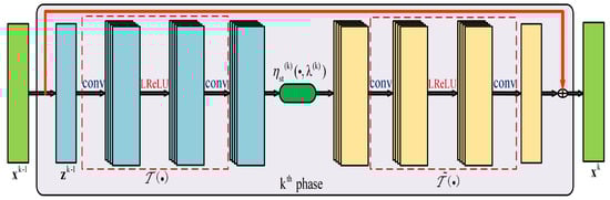 To map ISTA into a convolutional network, the linear transform is replaced by a nonlinear transform , where , ⊗ denotes convolution operation, A and B denote the first and second convolution respectively. Subsequently, Equation (16) can be rewritten as: