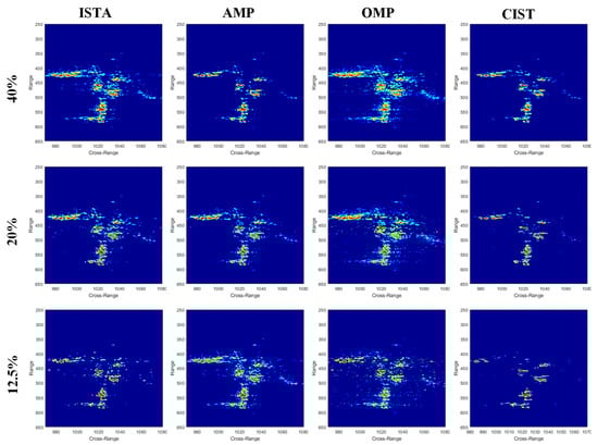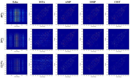 Figure 8 gives the imaging results of data I of the four algorithms at different down-sampling ratio. The first column shows the the input echo data at different down-sampling ratio; the other four columns present the imaging results. It can be seen that as sampling ratio decreases, the imaging quality of ISTA, AMP, and OMP become worse obviously. Specifically, ISTA and AMP lost the weak reflective parts of the target, and OMP has the highest side lobe. On the other hand, the results of CIST maintain a relatively complete target as well as a clean background. When the sampling ratio is as low as 12.5%, the results of ISTA and AMP are almost unusable, while CIST can still achieve satisfactory imaging result, which implies the robustness of CIST.