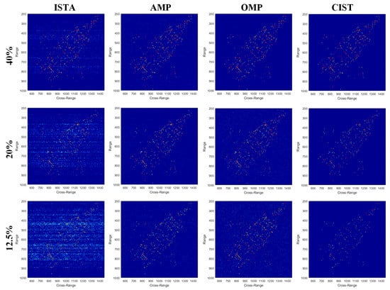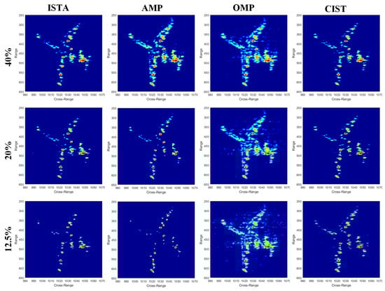 When considering the lack of true value of imaging target, which determines the results of RNMSE and FA, we use only TCR and ENT as the quantitation criteria of different methods. From the evaluation result of data I in Table 3, CIST achieves the highest TCR and lowest ENT at sampling ratio at 40% and 20%. In the special case, where the ratio is 12.5%, results of ISTA and AMP have the highest TCR and lowest ENT. But their imaging results are lacking some part of the target, i.e., the wings and fuselage only contain the stronger points but missing some weak points (around cross-range 1010–1040 and range 350–500), which leads to the superficially best evaluation results. After ignoring these disturbing results, CIST still has the better evaluation results than OMP. In addition, while conventional methods take generally more than 30 s for imaging process, CIST only takes less than one second (tens of times faster). Therefore, from the results of measured experiments, CIST has shown its robustness and high computational efficiency.