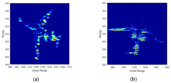 In order to test the network’s performance realistically, we use two group of real measured ISAR scatter of a plane(Yak-42) as test data (named as data I and data II). The Yak-42 data was collected by a ground-landed radar which operated at C-band and the bandwidth is 400 MHz. Each of the full data consists of 2048 pulses in cross-range, and each pulse contains 1024 samples. Note that the echo data has been range compressed and well motion compensated.The high resolution ISAR imaging results achieved by RD algorithm with full data are presented in Figure 7. The range compressed data are imported into CIST after randomly down-sampled to ratio at 40%, 20%, and 12.5%.
