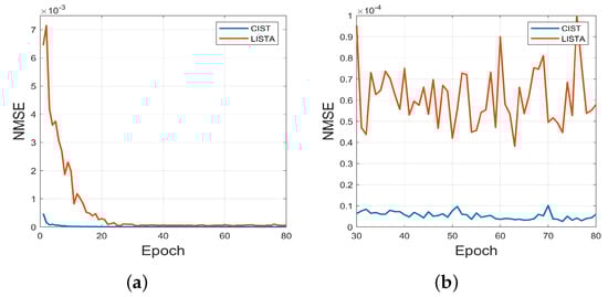 Convergence of CIST and LISTA of Epoch (a) from 0 to 80, (b) from 30 to 80.