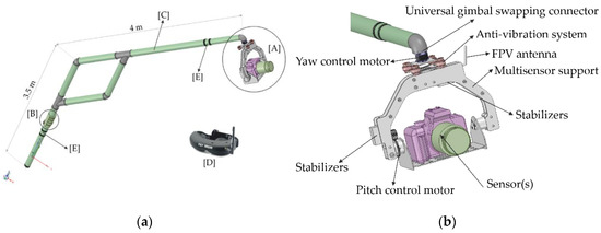 - [E] Telescopic extenders (Figure 1a): The main structure can be contracted to facilitate its transport and can be adapted to the geometric characteristics of each scenario. The lower part unfolds up to 2.5 m, while the upper part can reach up to 4–4.5 m, in order to overcome obstacles and increase the vertical sensor-object distance. Due to the angle designed between the two main structures, it allows the camera to be raised to a maximum height of 3.5 m when using it supported on the ground.