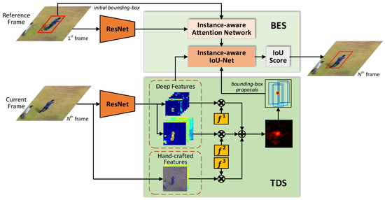The BES accurately estimates the target bounding-box based on the proposals given by the TDS. Visual object tracking in a scene usually focuses on specific instances of a given object rather than a class of objects. Therefore, we designed two sub-networks, one for modeling the instance-based prior knowledge of the given object, and the other for estimating the IoU scores against different proposals in the current frame, namely instance-aware attention network and instance-aware IoU-Net, respectively. The BES accepts the following four inputs: (1) deep features of the current frame, (2) the region proposals generated from the current frame, (3) deep features of the reference frame, and (4) the target bounding box in the reference frame. It outputs the predicted IoU scores of the region proposals in each frame. In the tracking process, the final bounding box was obtained by maximizing the score value with gradient ascent. We discuss this stage in detail, in Section 3.3.