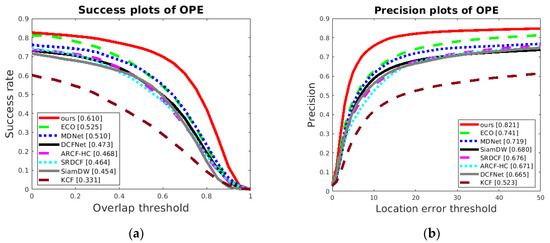 Comparison results of several state-of-the-art trackers on the UAV123 dataset [15]. The values close to the name of the methods represent the area under curve (AUC) or the precision when the threshold of location error is set as 20 pixels. (a) The success rate plot; (b) The precision plot.