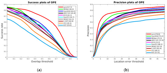 Comparison results of several state-of-the-art trackers on the UAVDT dataset [16]. The values close to the name of the methods represent the AUC or the precision when the threshold of location error is set as 20 pixels. (a) The success rate plot; (b) The precision plot.