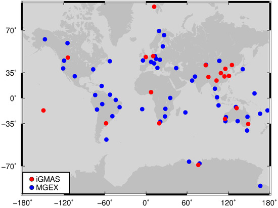 Distribution of 80 MGEX (blue dot) and iGMAS (red dot) stations.