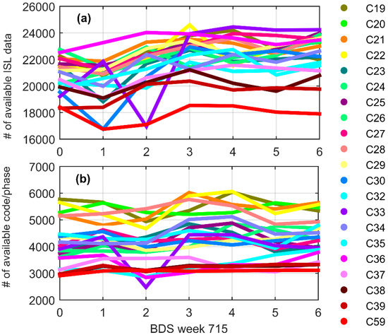 Number of available data in BDS Week 715: (a) the number of dual one-way ISL measurements, where outliers and single one-way observations that cannot form a dual one-way link are discarded; and (b) the number of code/phase measurements, where outliers and observations of short arcs less than 1200 s are discarded.