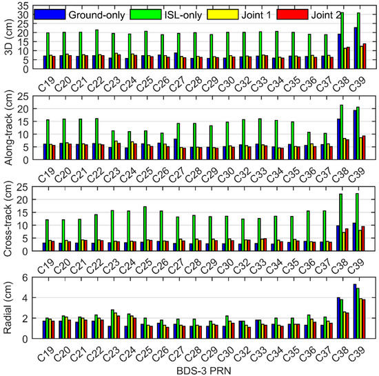 According to Figure 3 and Table 2, it can be found that the addition of ISL data has a positive effect on the orbit determination. For the ground-only POD, the overlapping accuracy of MEO satellites is similar to that of Joint 2 POD and higher than Joint 1 POD because there are currently enough globally distributed ground stations to observe MEO satellites. On the other hand, the overlapping errors as an indicator of internal coincidence precision reflect the internal consistency of the orbit estimates, not the true accuracy. Besides, the improper weight of ISL data may also affect the contribution of ISL data on joint orbit determination, which needs further research in the future. Different from MEO satellites, the IGSO satellites can only be observed by iGMAS stations located in the Asia-Pacific region during the evaluation period. Therefore, the accuracy of Joint 2 has been significantly improved by 38.8% and 43.5% after adding ISL data for satellites C38 and C39, respectively. As a GEO satellite, satellite C59 has the characteristic of geostationary and high orbit height, and it can only be tracked by ground stations near the Asia-Pacific region similar to IGSO satellites. With the help of ISL, the weak geometry of the GEO satellite is strengthened, and the number of measurements is increased. Compared with ground-only results, the Joint 1/2 orbit accuracy of satellite C59 is greatly increased by 79.6%. As for ISL-only POD results, the orbit accuracy for the GEO satellite is greatly improved compared to the orbits obtained by ground-only POD strategy. It is noted that the ISL-only POD errors of the whole constellation in the along-track and cross-track direction are larger than those of the ground-only POD, except for the along-track direction of GEO satellites, which may be caused by the weaker orbital orientation constrain from only two anchor stations [12].