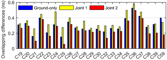 Since the orbit radial component is highly correlated with the clock offset parameters, the performance of the satellite clock offset estimated with the orbit parameters at the same time can also be used as an indicator to evaluate the accuracy of the orbits. Note that the ISL-only strategy does not solve the clock offset parameter. The clock overlapping differences of the two-day arc are computed based on two adjacent three-day arcs, and the RMS value is plotted in Figure 4. It can be found that the performance of the MEO satellite clock offsets became worse when applying the Joint 1 strategy, but the accuracy of clock offsets computed by the Joint 2 strategy shows a better performance than that of the ground-only strategy with an improvement of 27.0%, 49.5% and 122.3% for MEO, IGSO, and GEO satellites, respectively.