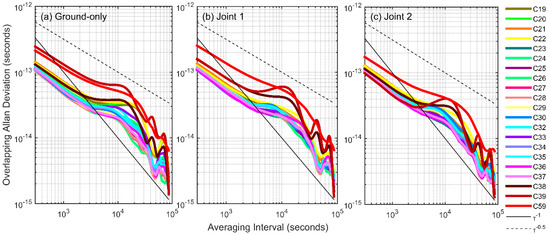 Overlapping Allan deviation of the satellite clock offsets estimated by: ground-only POD (a); Joint 1 POD (b); and Joint 2 POD (c).