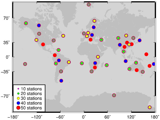 The number of ground tracking stations is crucial for the quality of POD results. On the one hand, sufficient tracking measurements are the guarantee of the accuracy of POD. On the other hand, redundant data will not improve calculation accuracy but will reduce calculation efficiency. As a rule of thumb, with 50 stations, an orbit with satisfactory accuracy can be determined [33]. Under the premise of high POD accuracy, we select different station networks to analyze whether the addition of ISL data can reduce the dependence of POD on the number of ground stations. These tracking station networks consist of different numbers of stations that are evenly distributed globally. With 10 stations as a unit interval, the number of stations is increased from 10 to 50 for the orbit determination. Different networks of tracking stations marked with different colors are plotted in Figure 6.