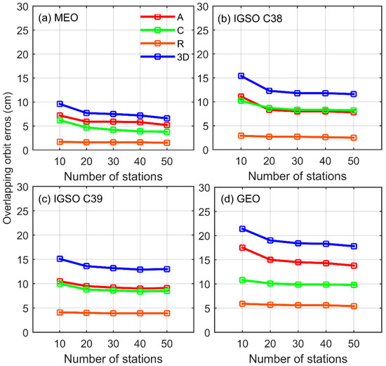 The overlapping orbit errors of BDS-3 satellites are plotted in Figure 7. The 3D errors of three types of satellites show an expected trend, that is, the more stations used, the higher the obtained accuracy. The accuracy of orbits obtained using 50 stations is similar to the accuracy of the results from 80 stations (see Figure 3). By using more stations, visible improvement is found in the along-track and cross-track directions, while the radial accuracy of these three satellites does not show much change. More importantly, according to the slope of the broken line in Figure 7, it can be inferred that the orbit accuracy changes most when the number of stations decreases from 20 to 10.