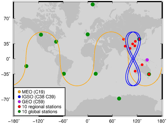 At present, the ground facilities of the BDS are all located in China. To verify the ISL improvement on POD when using only regional stations, which is crucial to the generation of broadcast ephemeris, a regional tracking network consisting of seven stations in China and three stations in Australia is selected. The results with or without ISL data are compared to precise orbits obtained from 10 globally distributed stations. The distribution of regional and global tracking stations, as well as the subsatellite points of three types of satellites, are plotted in Figure 8 in which the red dots represent regionally distributed stations and the green dots represent globally distributed stations.