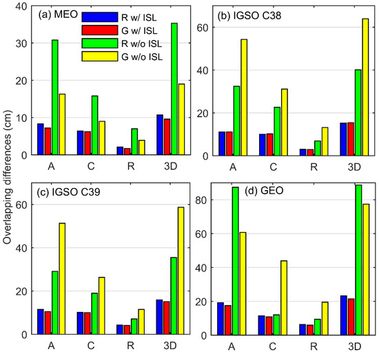 In terms of IGSO satellites, subject to the insufficient number of stations located in the Asia-Pacific region in our selected global tracking network, the orbit accuracy using the 10 regional stations (the green bars) in Figure 9b,c shows better performance than that using the 10 global stations (the yellow bars). Especially in the along-track direction, the RMS of IGSO satellites using the regional stations is 41.8% smaller than that using the global stations. After the addition of ISL data to POD, the accuracy obtained by the two strategies is comparable and the 3D error using regional stations is reduced to 15.2 cm.