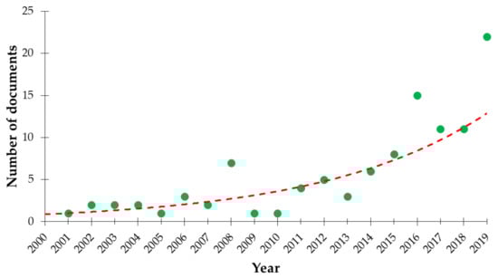 The results obtained in this work showed that the selected scientific communications were mostly published in articles (66%) and conference papers (32%), being predominantly published in English (95%). The results of the bibliometric analysis indicated that the number of articles per year increased exponentially, growing from one document published in 2001 to 22 in 2019. There was a particularly strong increase in the last four years, in which more than 55% of all documents were published.