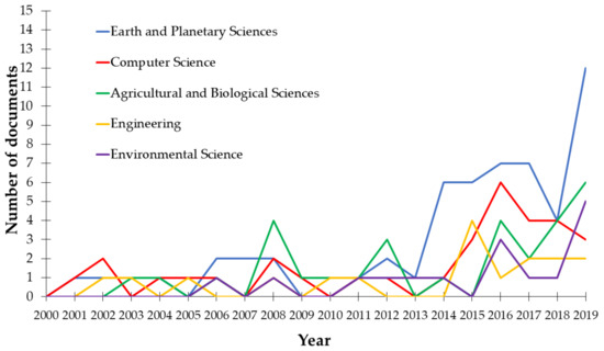 The documents published on RSAGPM between 2000 and 2019 were classified into 15 different categories according to the Scopus database, which can be considered a clear indication of the wide interest that this field of research has aroused in the scientific community. Figure 3 shows the evolution of the principal subject categories into which Scopus classified the 107 documents related to RSAGPM. It is worth noting that each document may be allocated to two or more categories at the same time. In this way, a significant portion of the sample was attributed to three domains, classifying up to 53% of the published documents as Earth and Planetary Sciences, 30% as Computer Science, and 28% as Agricultural and Biological Sciences. The classification was changing between the main categories just at the beginning of the period considered due to the low number of registered publications. However, a more consistent trend is observed at the end of the period, where the three predominant categories stand out along with the emergence of the category of Environmental Science.