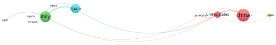 Figure 4 shows a network illustrating the international collaboration between publishing countries on RSAGPM. The size of each circle has been scaled with the number of publications of each country, while the thickness of each line joining two countries represents the number of collaborations between them. The assigned color allows us to distinguish the different groups formed by sets of countries (network cluster). As can be seen in Figure 4, three main clusters can be differentiated. The first cluster (red) is led by China, the most productive country. The second cluster (green) is headed by Italy, while the third (blue) is led by Spain, which presents a strong collaboration with Italy.