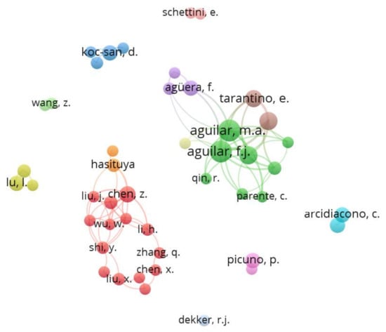 Figure 5 shows a network map illustrating collaborative co-authorship on RSAGPM from 2000 to 2019, where the different colors represent the clusters made up of different authors who usually collaborate with each other. From the obtained results, the most interrelated co-authorships are shown. Although several clusters are observed, mainly two can be pointed out. One is made up of mainly Chinese authors and the other is composed of Spanish and Italian authors. In this sense, it can be stated that these are the two more relevant research groups currently working on RSAGPM around the world. In addition, a highly complex and atomized collaboration network is observed within them.