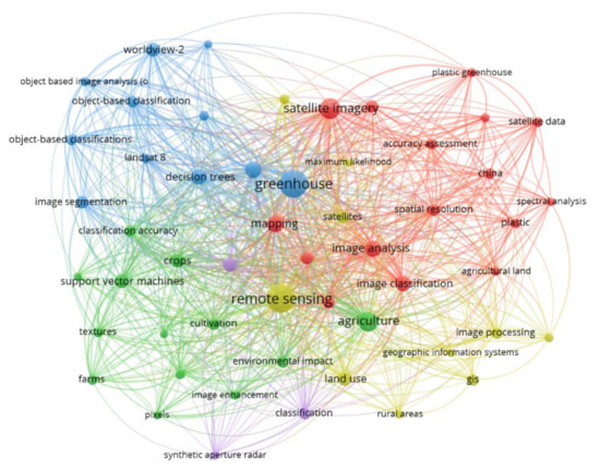 Figure 6 shows the network map that links the keywords to the entire sample of the publications analyzed. The size of the circle represents the number of publications in which each keyword appears, and the color represents the cluster in which the keyword is included according to the number of co-appearances. The first cluster (light brown) falls under the term “Remote Sensing”. It is also the cluster with the highest number of connections. The second group (blue) has “Greenhouse” as its main keyword, representing the productive agrosystem in which the analyzed topic focuses (intensive crop production). In the third group (red), the most frequent terms are “Satellite Imagery”, “Image Analysis”, “Mapping”, and “Image Classification”, which represent the most frequent tools (image analysis/classification from satellite imagery for mapping greenhouses) used to carry out the extraction and analysis of significant information from remote sensing data on the topic studied. The other colored clusters mainly refer to different methodologies for analyzing image data (e.g., “Object-based image analysis”); thus, they have less representation in Figure 6.