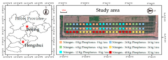 The experiment was conducted from June to August 2019, at the Dry Farming and Water-saving Agricultural Experimental Station in Hengshui, Hebei Academy of Agricultural Sciences, China. Figure 1 shows the location of the experimental station. The experimental station of Dry Farming and Water-saving Agriculture is located in Central China (latitude 37.9035011244, east longitude 115.7083898640), 22 m above sea level, and covers an area of 853 acres. The region belongs to the continental monsoon climate zone and is warm and semi-arid. The climate is characterized by four distinct seasons with large differences between warm, dry, and wet. The region has an average annual rainfall of 642.1 mm and dry winters.