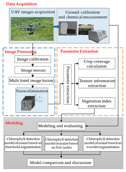 These studies highlight the critical need for dynamic influence elimination during crop growth stages on the basis of UAV spectral imaging. Several methods could be selected to improve the UAV-based imaging spectrum. However, much uncertainty still exists about the effects of these methods and their influence on the results of the chlorophyll content estimation of maize canopy during growth stages. We aim to clarify several aspects of chlorophyll content diagnosis of maize at different stages by using UAV spectral imagery. It also aims to eliminate the dynamic influences and explore its effects on the results. Moreover, the proposed methods could improve the accuracy of chlorophyll content diagnosis of field maize.