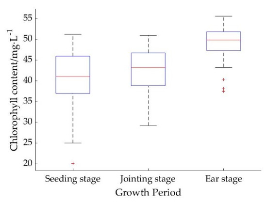 A total of three experiments were performed in this study. Seventy-two maize leaves were collected at the seedling, jointing, and ear stages for chlorophyll content extraction. A total of 216 samples were obtained during the three growth stages. The box plots of chlorophyll content in maize leaves at each growth stage are shown in Figure 3. The KS algorithm was used to divide the entire growth period samples according to different segmentation methods. The results are shown in Table 3. Table 3 illustrates that the training and validation sets contain a large number of chlorophyll content values for the total sample data.