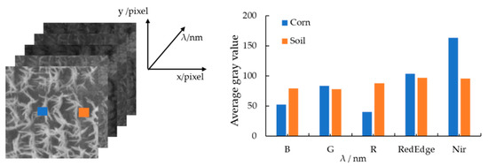 ENVI 5.2 software was used to draw the regions of interest of the maize canopy and the soil background in the multispectral image for exploring the effect of soil background on the reflectance of maize canopy in the multispectral image. The average gray value of the region of interest was extracted. The results are shown in Figure 4. The average gray values of the maize canopy and soil are different in five bands. The maize canopy gray values at the blue and red bands are lower than that of soil. The gray value of crop canopy in the green, red edge, and near-infrared bands is higher than that of soil, and the difference between the two reaches the maximum at near-infrared band. Therefore, accurate maize canopy spectral information can be obtained by removing the soil background from multispectral images.