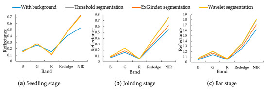 Figure 6 lists the maize canopy spectral reflectance trends extracted from the original spectral images and the three segmentation methods obtained during the three growth periods. In general, the spectral reflectance of the maize canopy decreases in the blue and red bands and increases in the green, red edge, and near-infrared bands after the multispectral image is segmented. This phenomenon presents the typical spectral feature of green vegetation with light absorption by chlorophyll and carotene pigment in blue and red bands, and relative higher light reflectance in green and NIR ranges. The effects of the three segmentation methods in different growth periods in Figure 6 vary. As shown in Figure 6a, the maize canopy coverage at the seedling stage is low, the soil background is highly visible, and the segmentation is easy; thus, the results obtained by the three segmentation methods are similar. The maize grows to the jointing and ear stages, and the maize canopy structure is complex, which is not conducive to background culling. Figure 6b,c show that the reflectance of ExG index segmented image is lower than image segmented by the wavelet or threshold methods. However, the performances of wavelet and threshold segmentation are very close in all three stages.