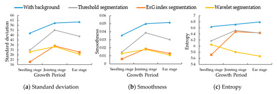 Three segmentation methods were used to eliminate influences form the soil background, all of which reduce the standard deviation, smoothness, and entropy of the image to a certain extent. Figure 7 shows that compared with ExG index segmentation method, threshold segmentation method and wavelet segmentation method can better reduce the standard deviation, smoothness, and entropy of the image. Firstly, the results of threshold segmentation method were higher than others. Even the standard deviation and entropy valued of the threshold segmented image are close to the image segmented by wavelet and ExG, respectively, its performances are not the best. Secondly, the standard deviation of ExG processed image is lowest at the seedling stage due to the soil background removal; the results of standard deviation and smoothing are close between ExG and wavelet segmentation methods at the jointing and the ear stage. When compared to the wavelet method, although the ExG method has lower values of standard deviation and smoothness, the entropy value of ExG segmented image is close to threshold segmentation and higher than wavelet segmentation at the jointing and the ear stage. It means that the randomness performances processed by threshold and ExG segmentation are higher than wavelet segmentation because of the limited elimination of canopy structure influences during these stages. Thus, the wavelet segmentation method has achieved stable results in the three growth stages.