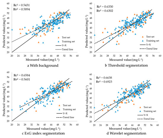 On the basis of the above analysis, the maize canopy multispectral image is segmented, and the background interference in the image is eliminated. The multispectral band reflectance, multiple vegetation indices, and maize canopy chlorophyll content were established to construct a PLS model. Correlation analysis was performed using the maize canopy chlorophyll content calculated by the model and the real value measured in the experiment. The maize canopy chlorophyll based on different segmentation methods was established by comparing the R2 and RMSE of the two groups of variables. The test model was analyzed, and the results are shown in Table 5. Figure 9 shows scatter plots of the predicted and true values obtained under different segmentation methods to intuitively display their relationship.