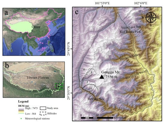Location of the study area: (a) Tibetan Plateau in China; (b) Gongga Mountain on the Tibetan Plateau; (c) Gongga Mountain location. Note: the “1”, “2”, “3”, and “4” denote the selected hillsides (i.e., first, second, third, and fourth hillside). The first and the third slopes denote sunny slopes, the second slope denotes a shady slope, and the fourth hillside denotes a mixed slope.