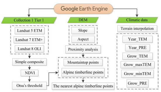 Remote sensing and geographic information technologies have recently become a practical means to identify the spatial distribution of alpine timberline [33,34]. The extraction methods of alpine timberline are mainly based on the supervised classification extraction and empirical normalized difference vegetation index (NDVI) values [35,36,37,38]. However, supervised classification requires the selection of training samples and human intervention, and these are characterized by several uncertainties with regard to the long-term monitoring of alpine timberlines. Meanwhile, the alpine timberline obtained by vegetation type boundaries is inaccurate, violating the timberline ecotone definition. Furthermore, empirical NDVI value is not very adaptable to different times, regions, and image data. The Otsu algorithm (the adaptive threshold algorithm) is introduced into Google Earth Engine to automatically determine the NDVI threshold of the alpine timberline ecotone, which addresses the aforementioned complications and improve computing efficiency. The Otsu algorithm finds an optimal threshold to distinguish relatively homogenous objects by maximising the inter-class variance [39,40,41]. Since the alpine timberline is an ecotone, the ecological vulnerability here is the lowest and the vegetation changes are the most unstable. Therefore, we retain vegetation and remove other land types (such as snow mountains, bare land, lakes and so on), and use the Otsu algorithm to obtain the NDVI threshold in the alpine timberline and to determine the location of the alpine timberline. The Google Earth Engine platform provides common remote sensing image data sets that can be called and calculated on online, providing convenience for the long-term monitoring of alpine timberlines [42,43].