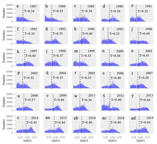 The annual Otsu NDVI threshold of Gongga Mountain from 1987–2019; (a) 1987; (b) 1988; (c) 1989; (d) 1990; (e) 1991; (f) 1992; (g) 1993; (h) 1994; (i) 1995; (j) 1996; (k) 1997; (l) 1998; (m) 1999; (n) 2000; (o) 2001 (p) 2003; (q) 2004; (r) 2005; (s) 2006; (t) 2007; (u) 2008; (v) 2009; (w) 2011; (x) 2012; (y) 2013; (z) 2014; (aa) 2015; (ab) 2016; (ac) 2018; and (ad) 2019.