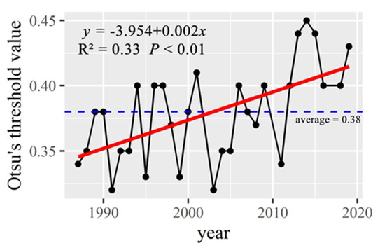 Figure 3 shows the annual Otsu threshold and the NDVI value distribution in the study area. The 30-year average NDVI threshold is 0.38 (Figure 4), and the lowest (Figure 3e) and highest (Figure 3z) NDVI thresholds are 0.32 in 1991 and 0.45 in 2014, respectively. Figure 4 shows the annual Otsu NDVI threshold change. The NDVI threshold of Gongga Mountain has increased significantly (R2 = 0.33, p < 0.01) at a change rate of 0.002/y from 1987–2019 (Figure 4).