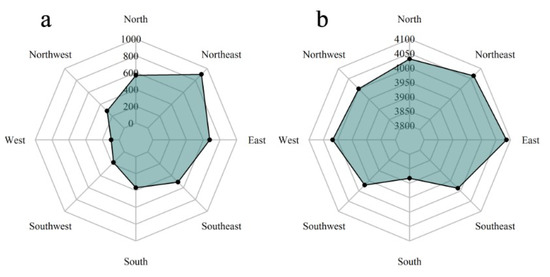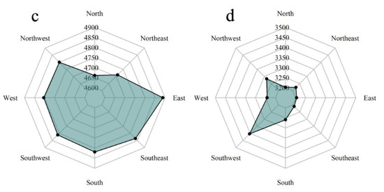 The aspect distribution of the alpine timberline points is different on Gongga Mountain (Figure 6). The northeast and west slopes have the highest (901) and lowest (177) number of nearest alpine timberline points, respectively (Figure 6a); the average elevation of the nearest alpine timberline points is highest (4085 m) and lowest (3882 m) on the east and south slopes, respectively (Figure 6b); the highest elevation of the nearest alpine timberline points registers a maximum and minimum on the east (4889 m) and north (4661 m) slopes, respectively (Figure 6c); the lowest elevation of the nearest alpine timberline points registers a maximum and minimum on the east (3404 m) and north (3202 m) slopes, respectively (Figure 6d).