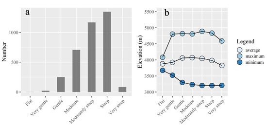 Distribution of nearest alpine timberline points on different slope classifications: (a) number of nearest alpine timberline points; (b) average, maximum, and minimum elevations of nearest alpine timberline points.