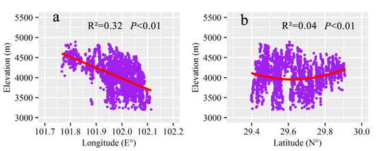 Figure 8 shows the relationships between the elevation of the nearest alpine timberline points and the longitude and latitude. There was a significant relationship between the longitude and elevation of the alpine timberline (R2 = 0.32, p < 0.01, Figure 8a). Conversely, the relation between latitude and elevation was not significant (binomial fitting: R2 = 0.04, p < 0.01, Figure 8b). The elevation of the alpine timberline points generally drops gradually from west to east (Figure 8a), but the number of alpine timberline points increases from west to east. There are fewer alpine timberline points at high latitudes than at low latitudes (Figure 8b).