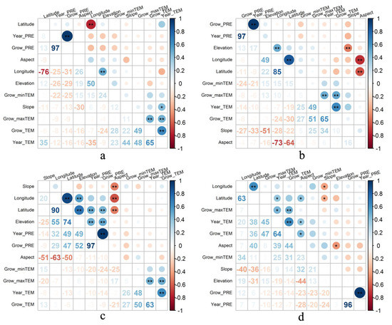 Relationship between the nearest alpine timberline and meteorological and topographic factors on: (a) the first hillside, (b) the second hillside, (c) the third hillside, and (d) the fourth hillside. Note: Figure 1 shows the locations of hillsides 1–4; ** and * indicate significance coefficients of less than 0.01 and 0.05, respectively.