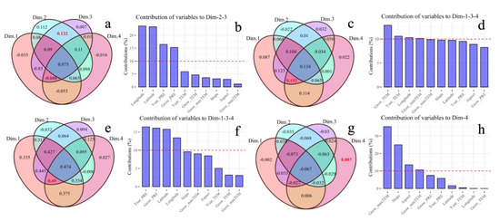 Interaction of driving factors based on multiple linear regression and principal component analysis for the alpine timberline and the contribution of driving factors to the principal components on different hillsides: (a) R2 value of multiple linear regression of principal components to the nearest alpine timberline on the first hillside; (b) contribution of driving factors to Dim.2 and Dim.3 on the first hillside; (c) R2 value of the multiple linear regression of principal components to the nearest alpine timberline on the second hillside; (d) contribution of driving factors to Dim.1, Dim.3, and Dim.4 on the second hillside; (e) R2 value of the multiple linear regression of principal components to the nearest alpine timberline on the third hillside; (f) contribution of driving factors to Dim.1, Dim.3, and Dim.4 on the third hillside; (g) R2 value of the multiple linear regression of principal components to the nearest alpine timberline on the fourth hillside; (h) contribution of driving factors to Dim.4 on the fourth hillside. Note: Dim1, Dim2, Dim3, and Dim4 are the first, second, third, and fourth principal component, respectively.