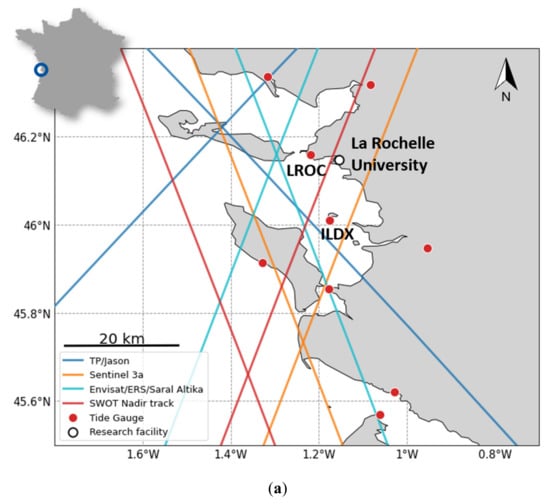 On the west coast of France, the Pertuis Charentais is a rich coastal area which includes islands and estuaries (Figure 1a). The area is highly covered by nadir altimetry missions (Topex/Jason, SARAL, Sentinel-3) and the future SWOT mission. A large in-situ observation network has been developed, including a permanent observatory on Aix Island, which provides long time series of sea-level [17] using both tide gauge and vertical land motion information. At La Rochelle University, the LIENSs (Littoral Environnement et Sociétés) laboratory offers expertise and resources (boat, buoys, pressure sensors, etc.) to organize in-situ observation campaigns, including cal/val activities.