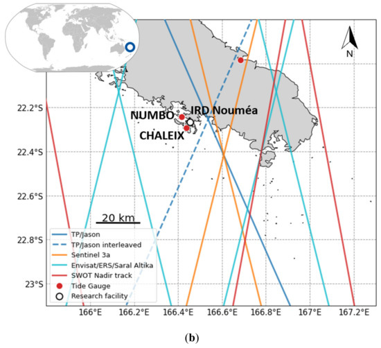 Study areas and altimetry coverage; (a) The Pertuis Charentais area near La Rochelle, in the west coast of France; (b) Noumea lagoon in New Caledonia.