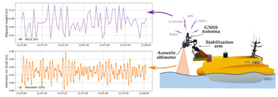 Uncompensated acoustic altimeters have a well-known dependence on air temperature gradients [20]. For example, the French Hydrographic Service (Shom) detected errors up to 7 cm using the Brest-Penfeld acoustic altimeter for large air-draft [21]. Particular attention should be given to the choice of the acoustic sensor according to the estimated measurement range. In the case of the PAMELi USV, the air-draft is relatively low and constant, and therefore, an acoustic sensor was preferred to a radar altimeter because of its high-frequency measurement capacity (up to 20 Hz) without data loss. Both of the acoustic sensors we used are temperature compensated, and experiments are being developed to fully qualify the compensation accuracy.