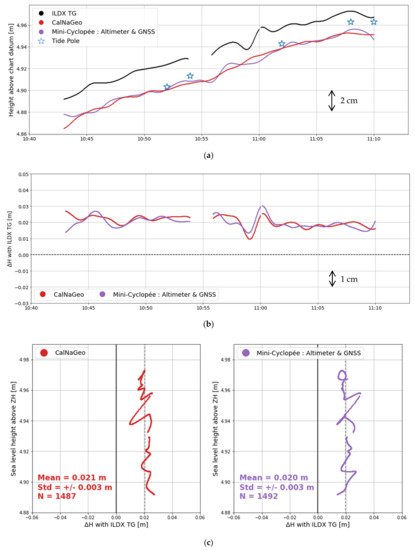 Results of the static session at ILDX tide gauge (27 June 2019) (a) Time series of sea-level height above chart datum measuring by the ILDX tide gauge (black line), CalNaGeo GNSS towed carpet (red), Mini-Cyclopée full system with acoustic altimeter and HARXON D-Helix antenna (violet) and a tide pole (blue stars); (b) sea-level height differences between ILDX tide gauge and CalNaGeo GNSS carpet (red) and Mini-Cyclopée full system (violet); (c) Van de Casteele diagram showing instrument height differences from the tide gauge versus the water height (referenced to chart datum).