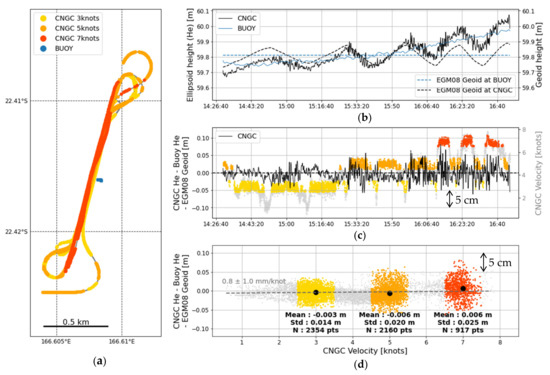 Observations are noisier as the velocity increases, with SSH standard deviation increasing from σ = 1.4 cm at 3 knots to σ = 2.5 cm at 7 knots (Figure 8d). However, the average difference in SSH observed by the GNSS carpet and the GNSS buoy remains sub-centimetric along straight profiles, as well as during turns. We observe a waterline variation of about 0.8 ± 1 mm/knot, largely dominated by noise at high speed, which agrees with previous speed tests in Corsica (Supplementary Materials—Figure S3). According to these results, the towing speed of CalNaGeo does not affect its height measurements. The observed differences are not characteristic of a planning effect and may instead be a consequence of GNSS height computations.
